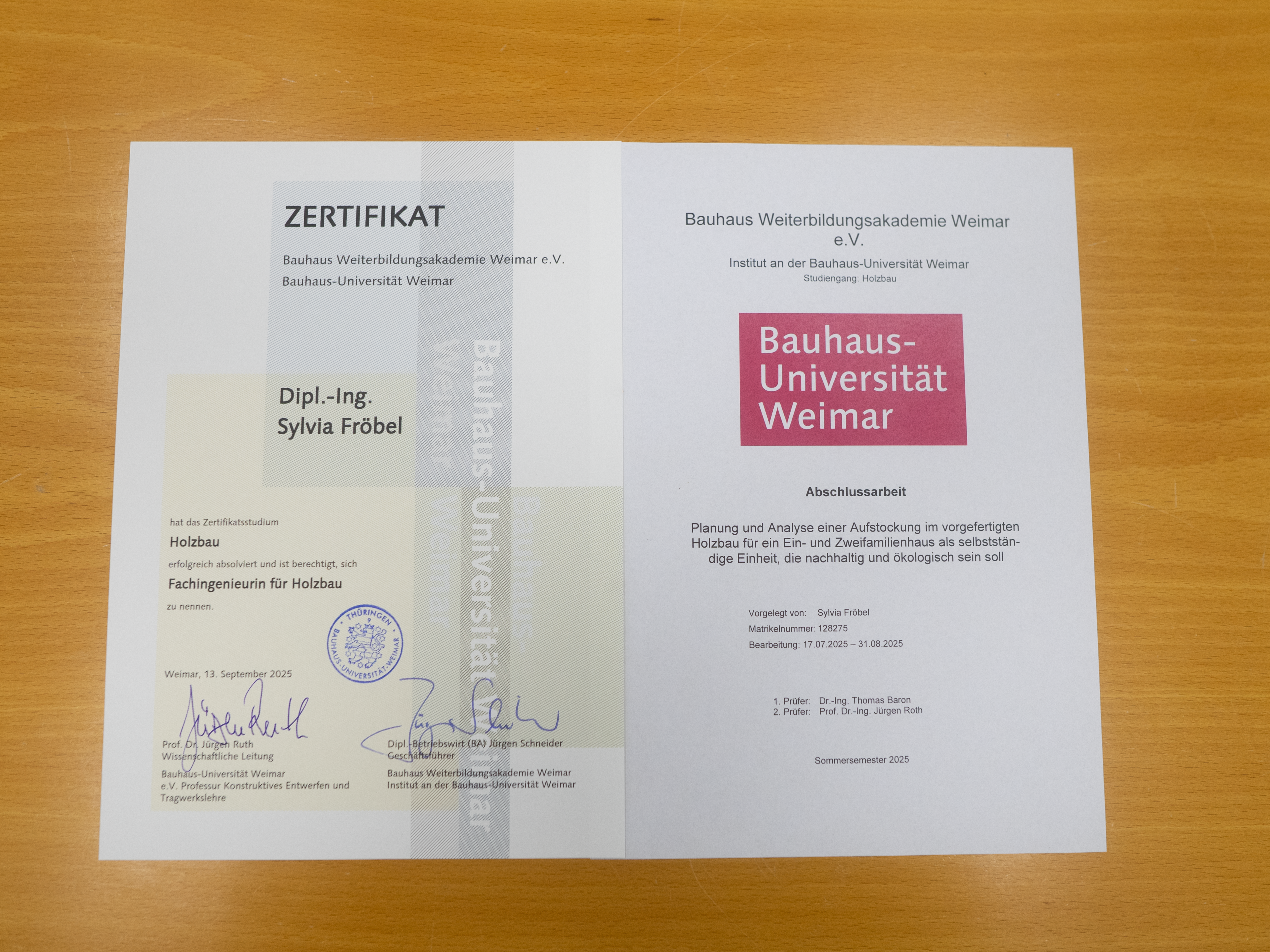 Frau Fröbel hat Ihr Studium als Fachingenieurin für Holzbau Anfang 2025 in Weimar begonnen und im September 2025 erfolgreich abgeschlossen.